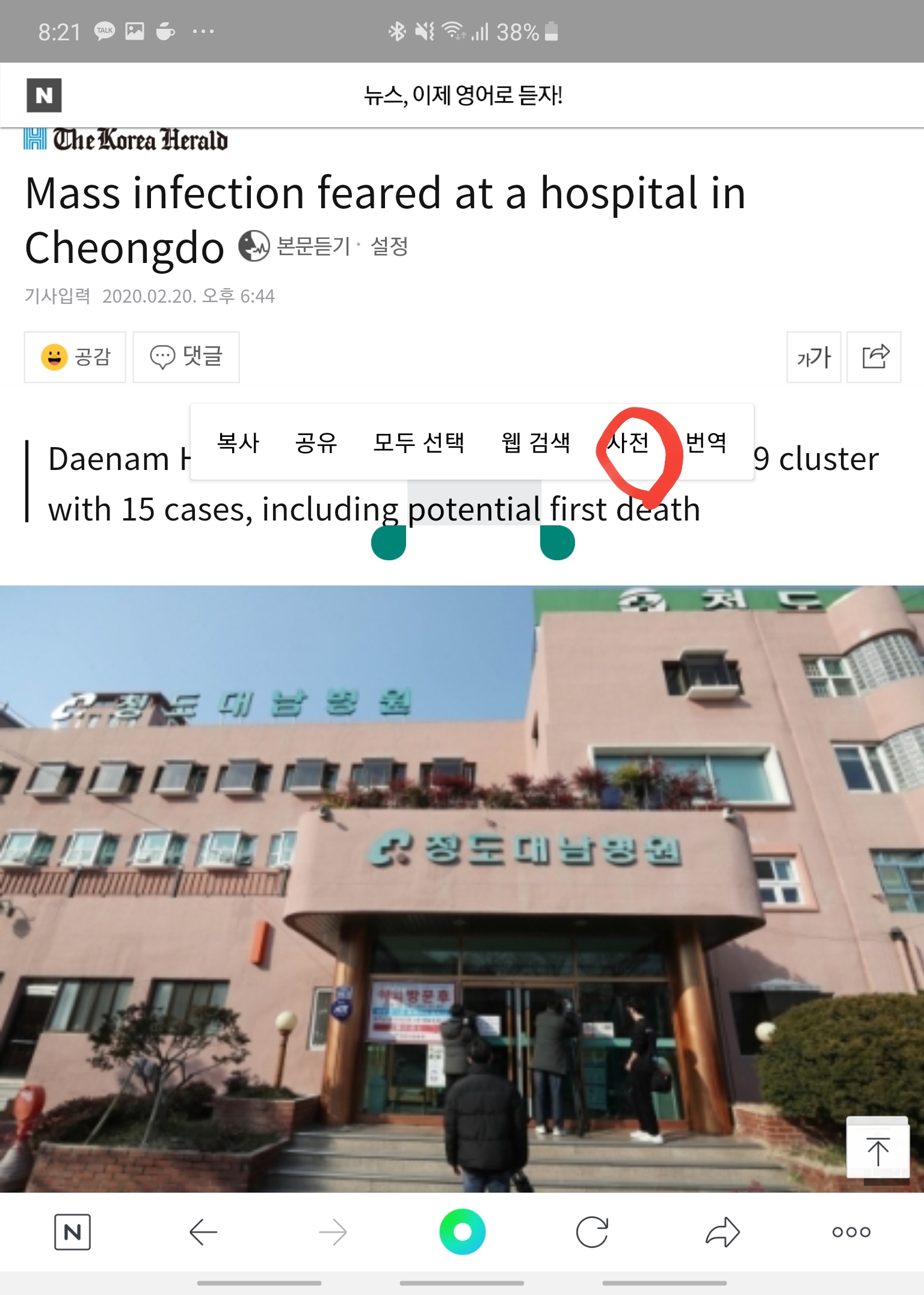 모르는 단어가 나오면 길게 눌러서 사전 기능을 사용할 수 있습니다.