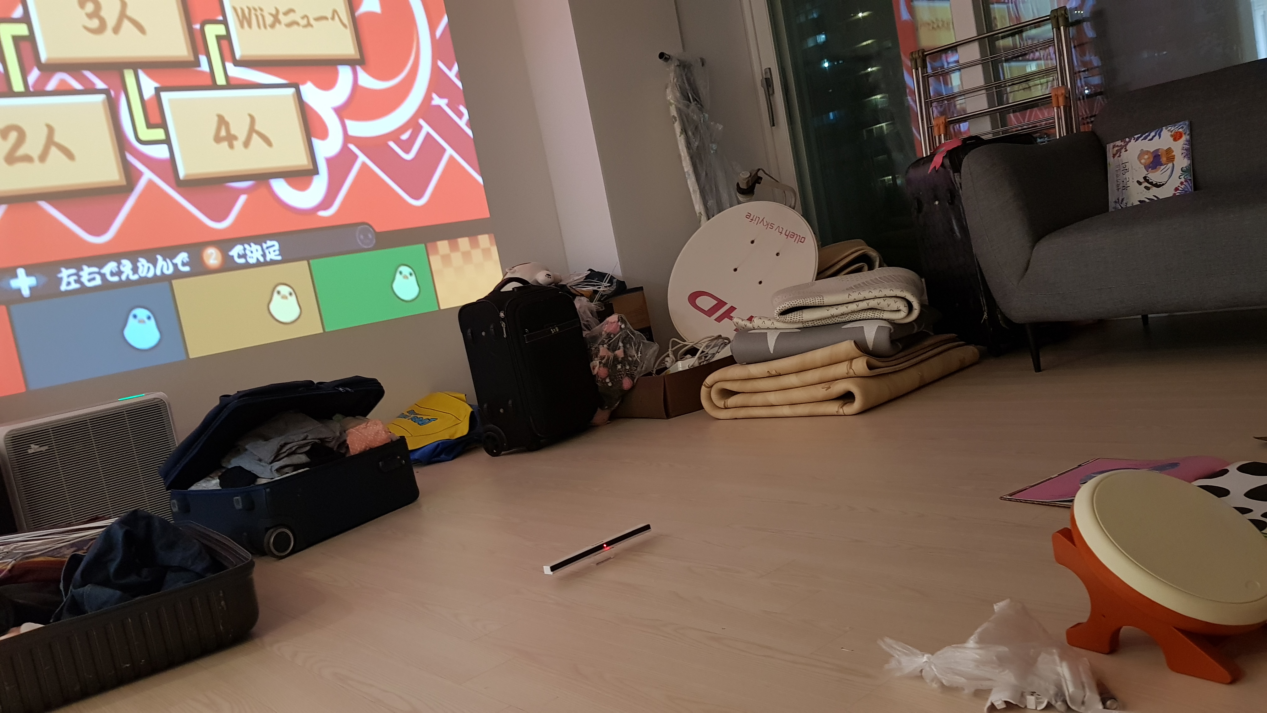 철거를 못해서 아쉬웠지만.. 철거를 못한 결과, 프로젝터와 매우 좋은 상성을 이루는 기능 벽이 됩니다.