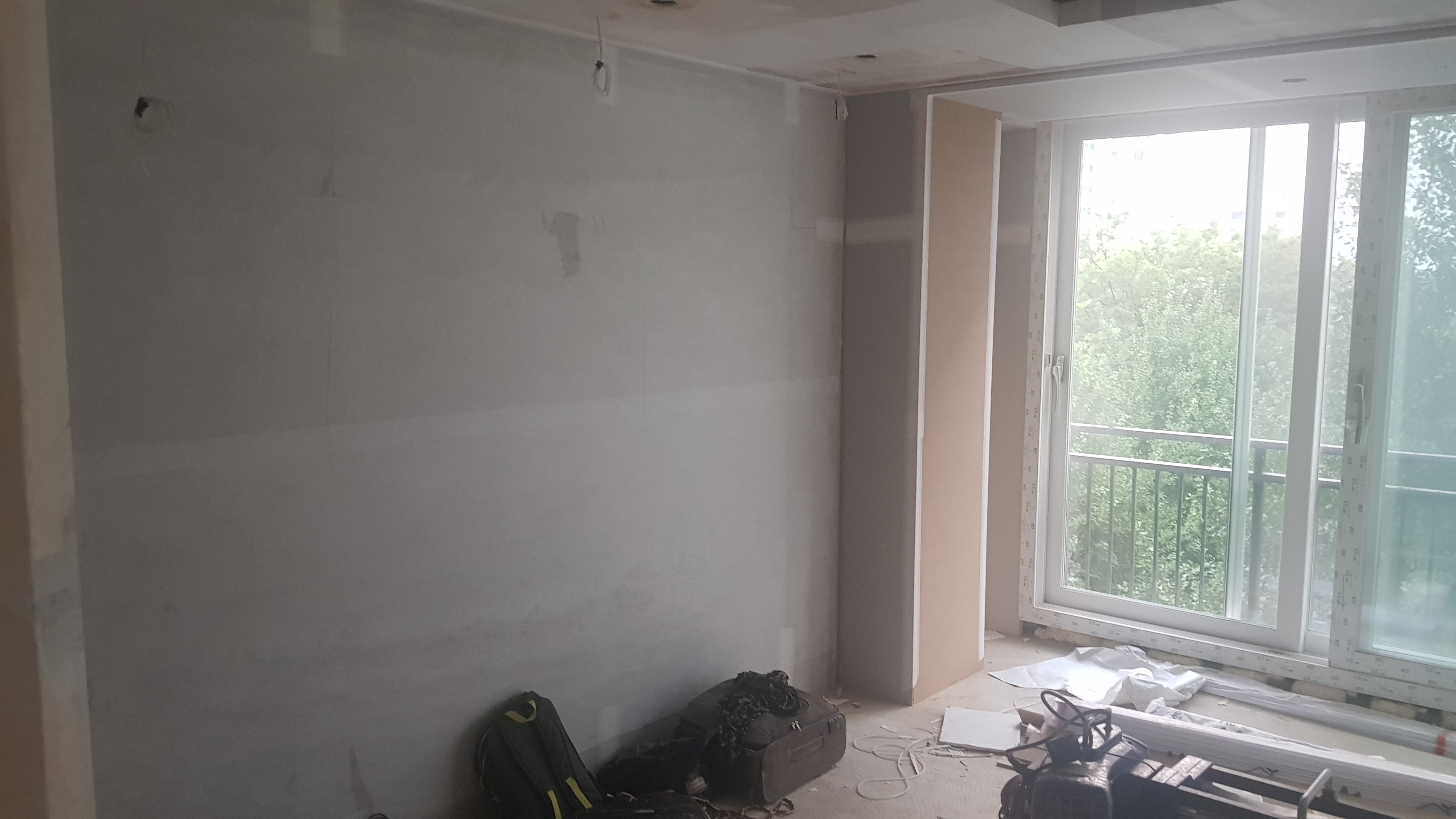 스크린으로 쓰일 벽면이 오래된 아파트의 특징으로 고르지 못하다고 판단되어, 시공사에서 합판 시공을 해주셨습니다.