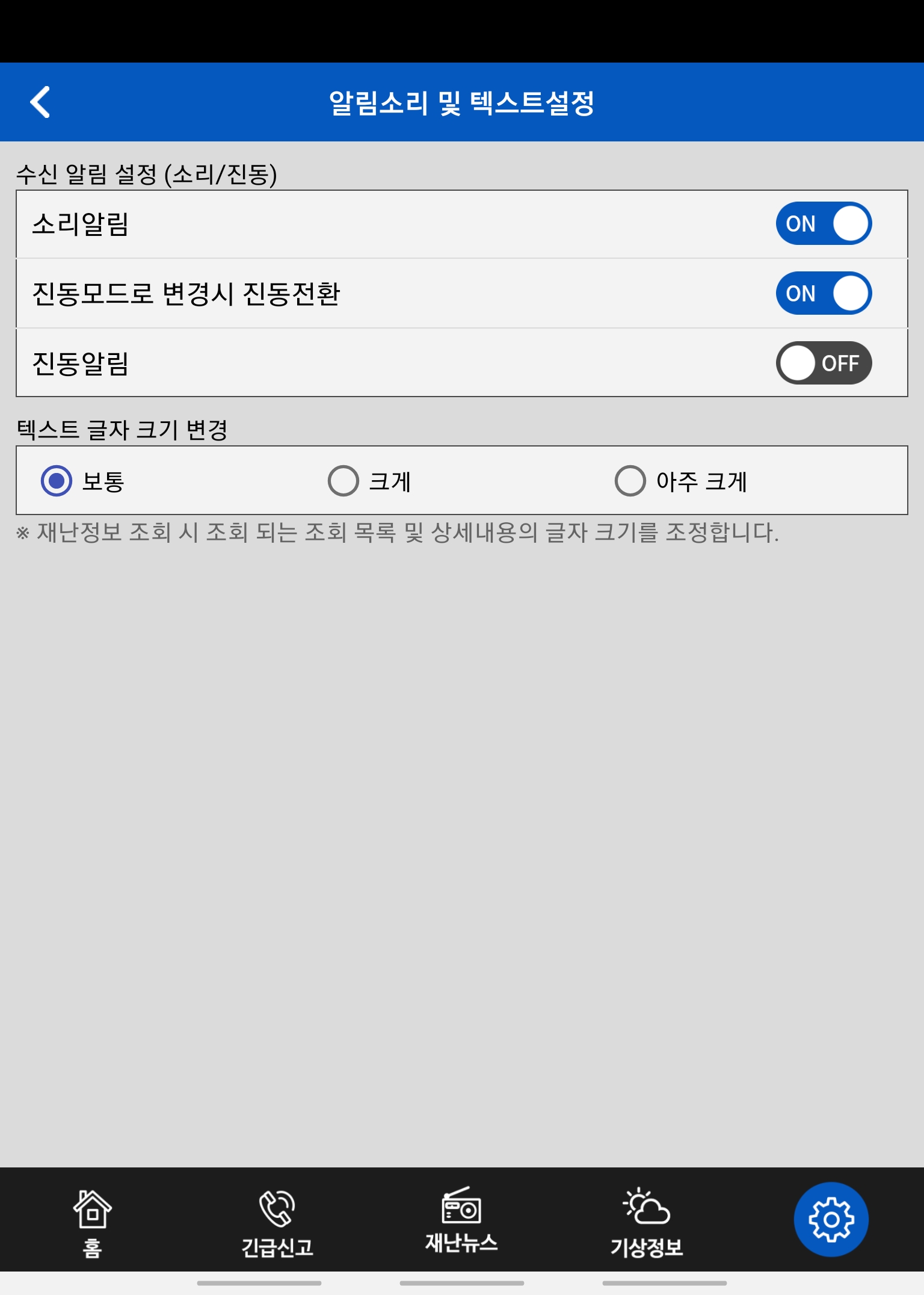 7. 가장 우측의 환경설정으로 들어갑니다. 재난문자를 수신알림을 켜줍니다.