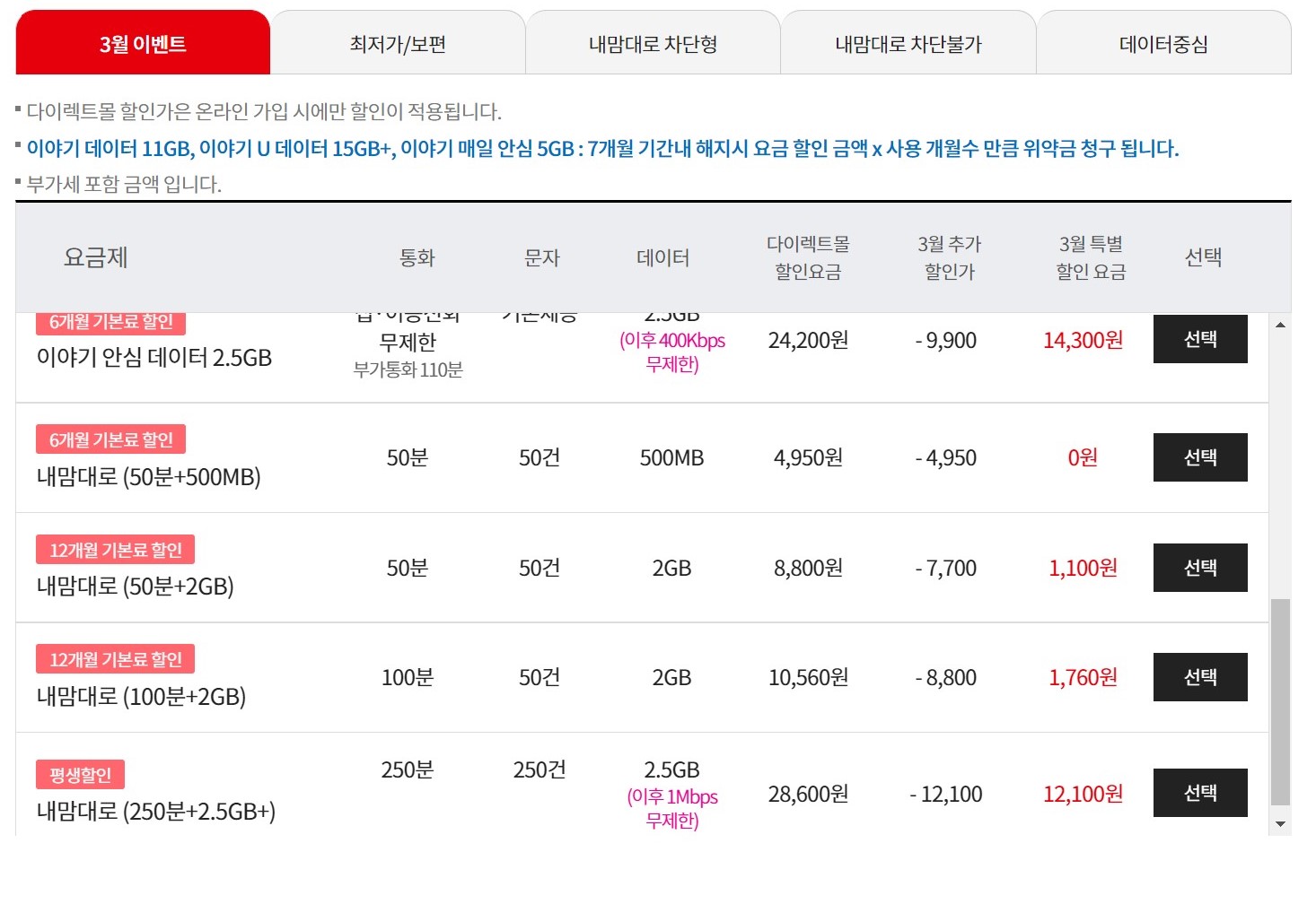 이야기텔레콤 이벤트의 주력으로 밀고있는 내맘대로 50분+500메가(6개월 무료, 그이후 4,950원)를 보면 문자가 50건밖에 되질 않아요..