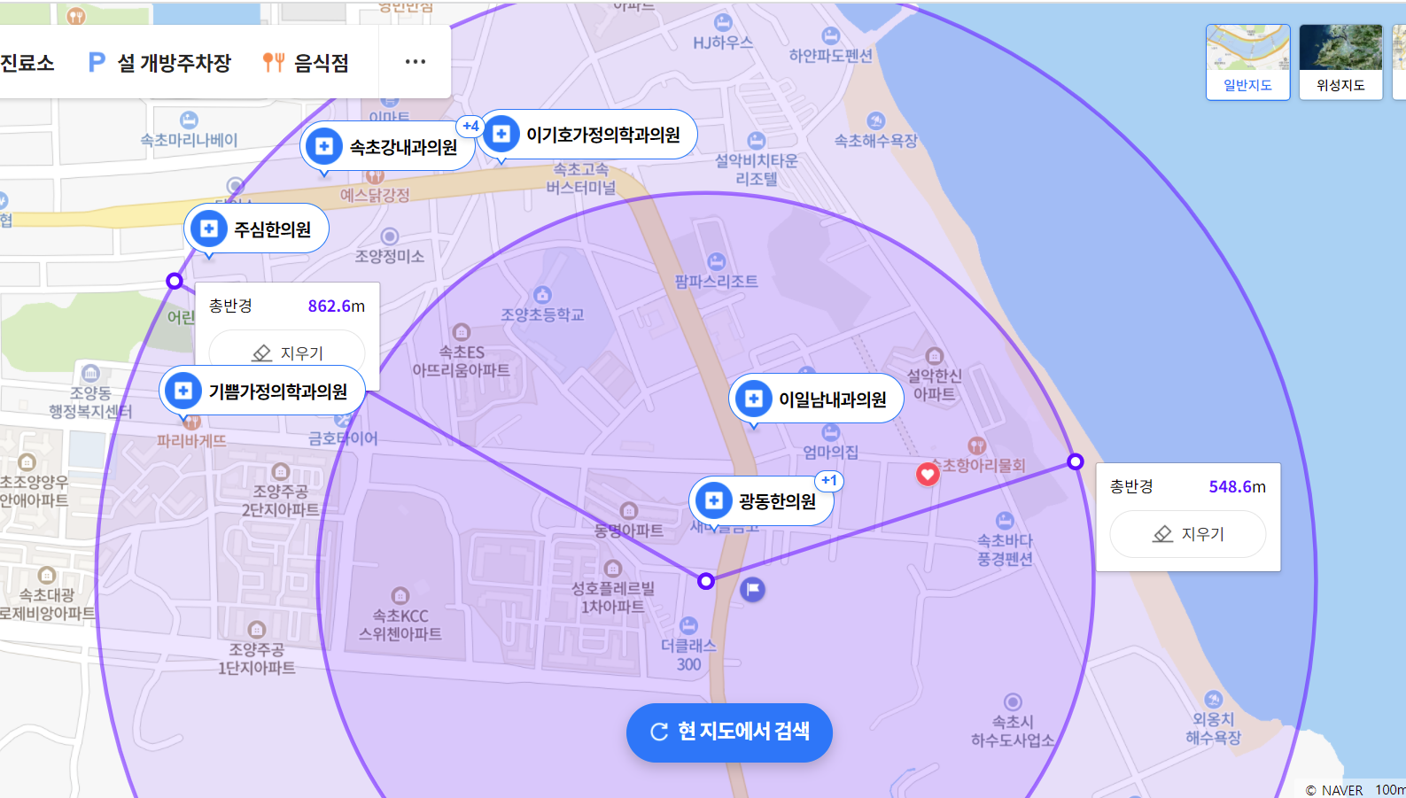 신시가지로, 아파트 주택가(속초 자이 등)가 바다 반대쪽으로 형성되어 있어, 병원도 어렵지 않게 찾을 수 있습니다.