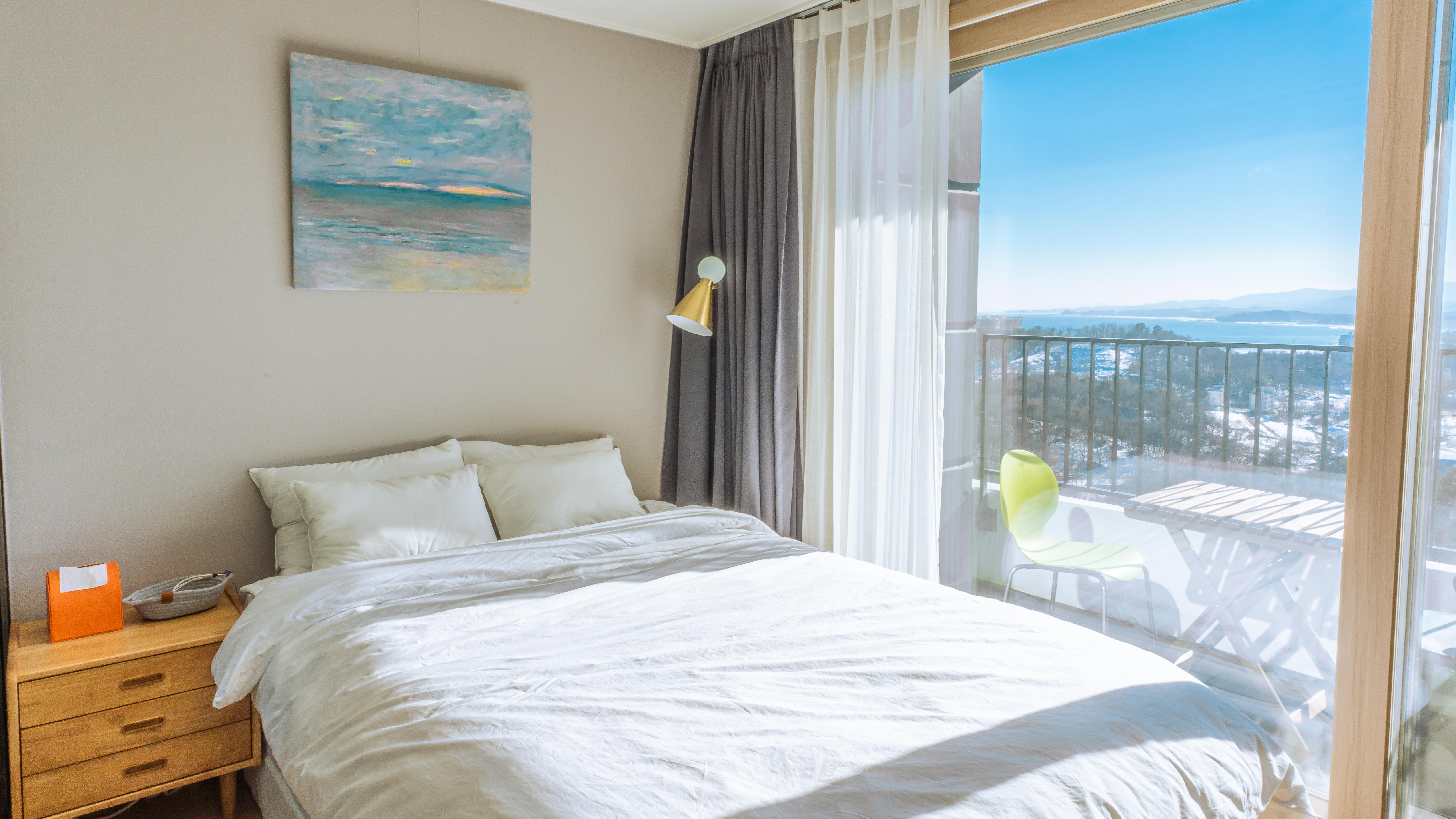 침대 옆으로 보이는 바다가 벽에 걸린 그림과 신기한 조화를 이루고 있습니다.