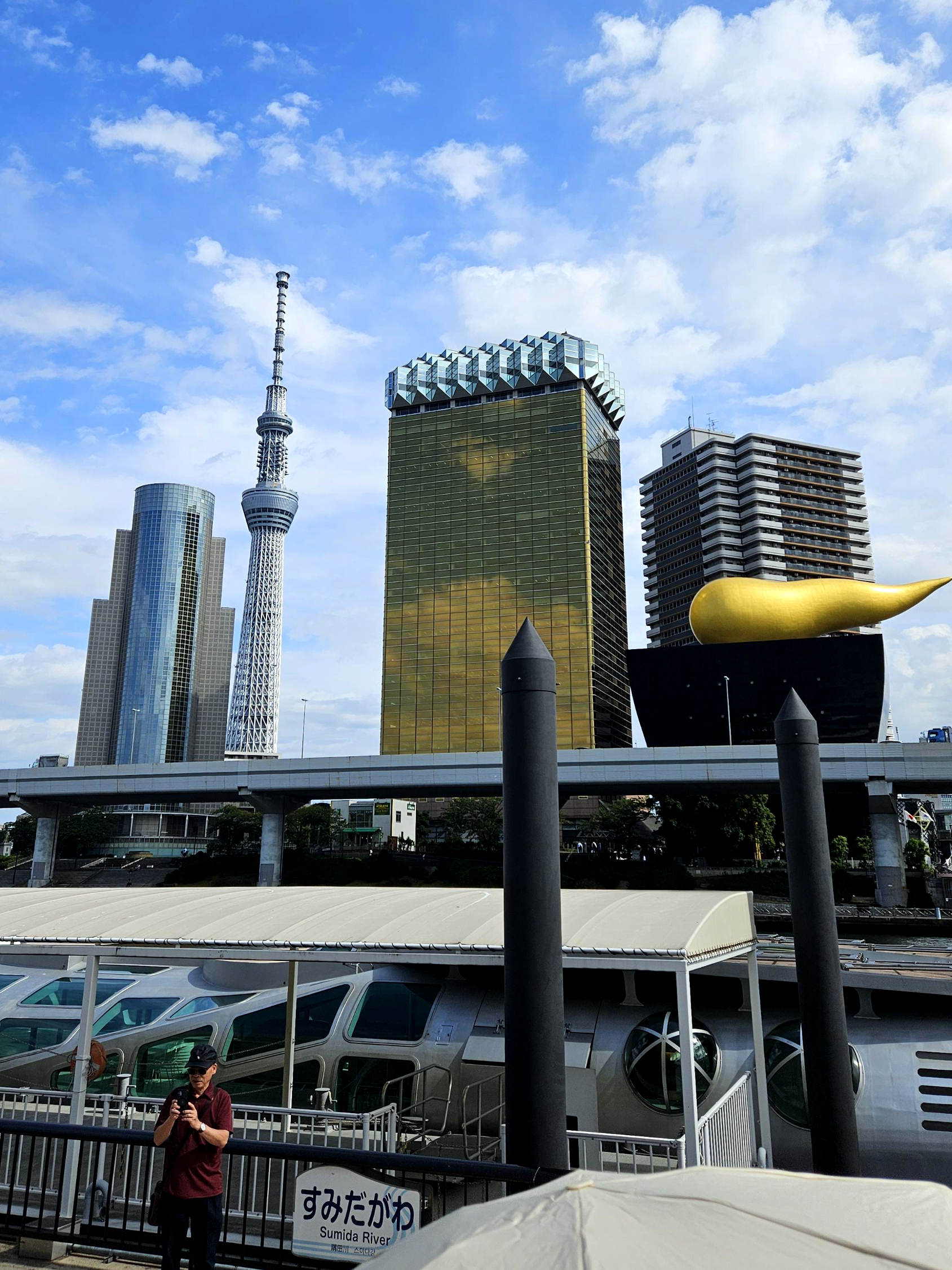 아즈마 다리를 건너면 맞은편의 아사히맥주 빌딩(잔에 따른 맥주와 거품을 형상화 했다고 하죵)이 보입니다.
