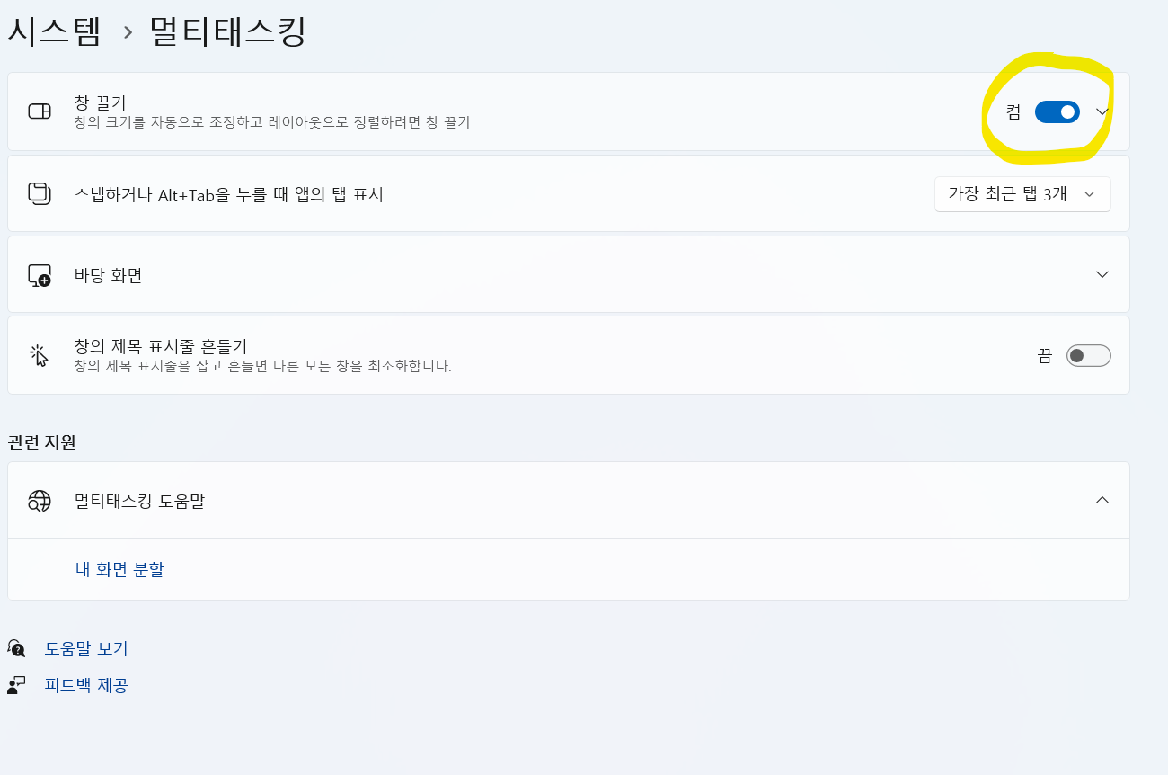 멀티태스킹기능을 끄더라도 창을 반으로 나누거나 하는 멀티창은 윈도우키+←,→ 으로 가능합니다.