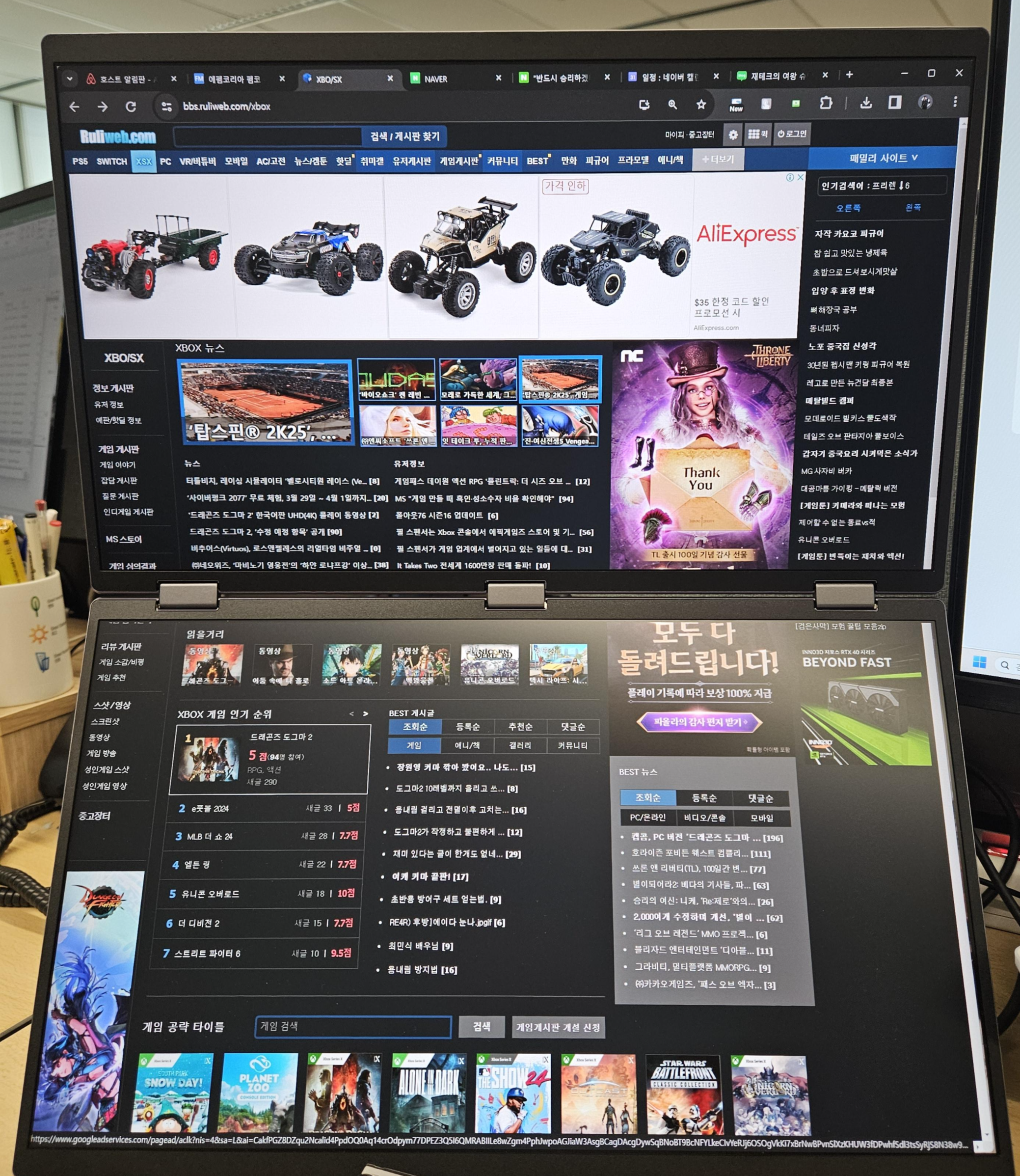 이 듀얼스크린 모니터로 브라우징을 위아래로 이어서 보니, 좌우도 시원하고, 위아래로 길이도 시원합니다.