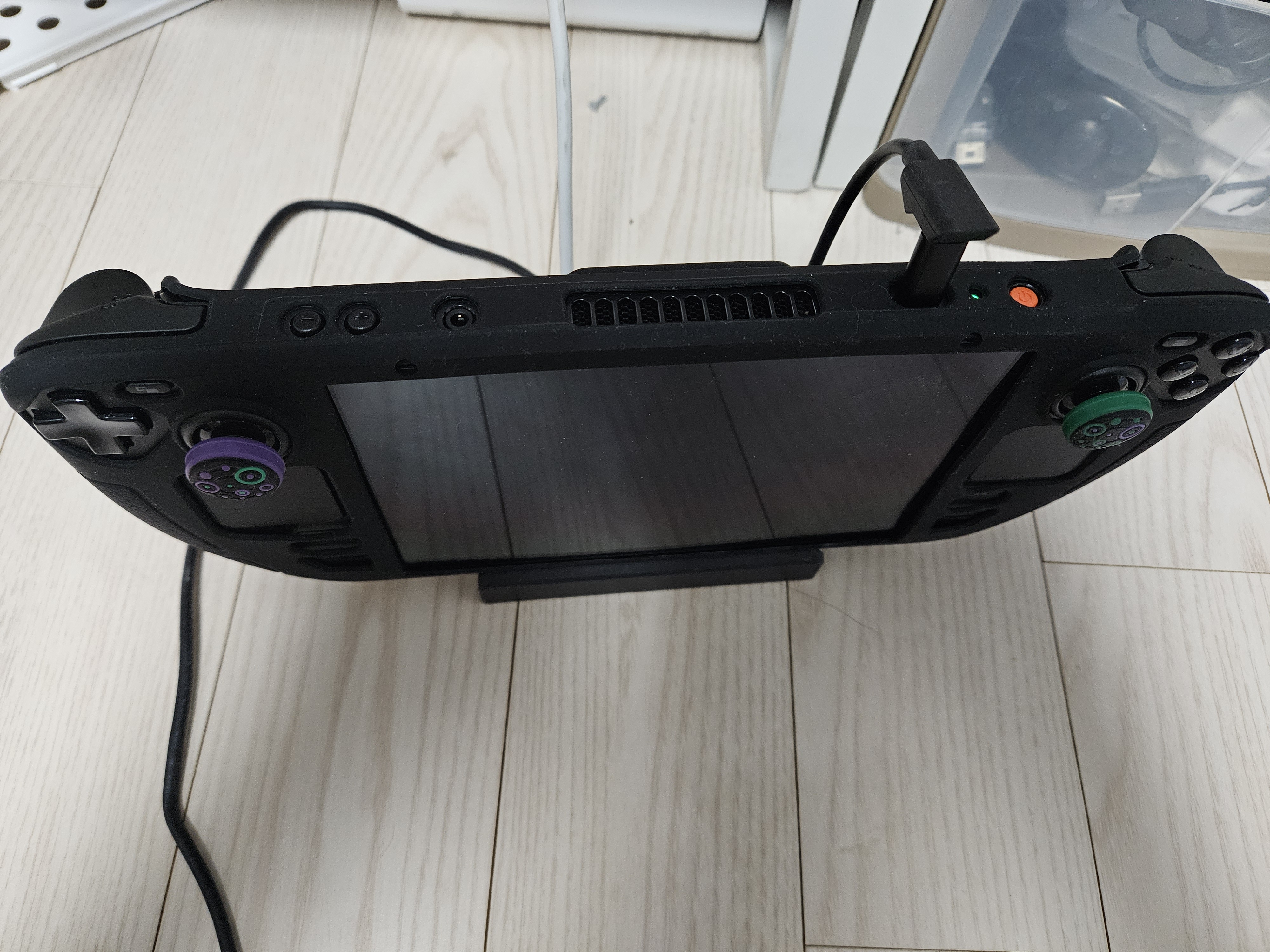 스팀덱에 실리콘 케이스를 씌우고도 잘 연결되고, 충전도 잘되네요. (스팀덱 OLED 입니다.)